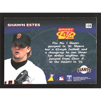This is a 1996 Sportflix Shawn Estes baseball card. The card is #134 and pictures show condition.