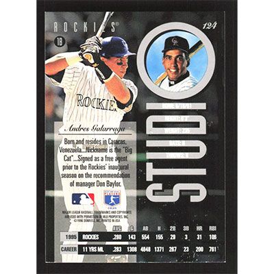 This is a 1996 Studio Andres Galarraga baseball card. The card is #124 and pictures show condition.