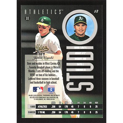 This is a 1996 Studio Jason Giambi baseball card. The card is #13 and pictures show condition.