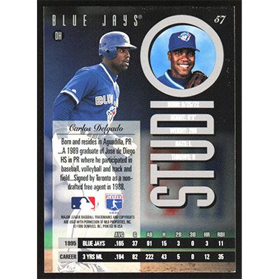 This is a 1996 Studio Carlos Delgado baseball card. The card is #57 and pictures show condition.