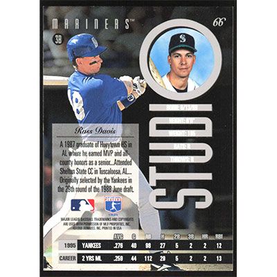 This is a 1996 Studio Russ Davis baseball card. The card is #66 and pictures show condition.