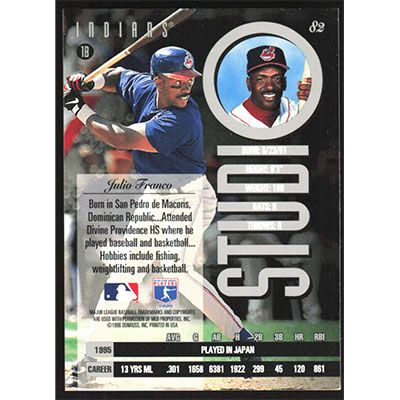 This is a 1996 Studio Julio Franco baseball card. The card is #82 and pictures show condition.