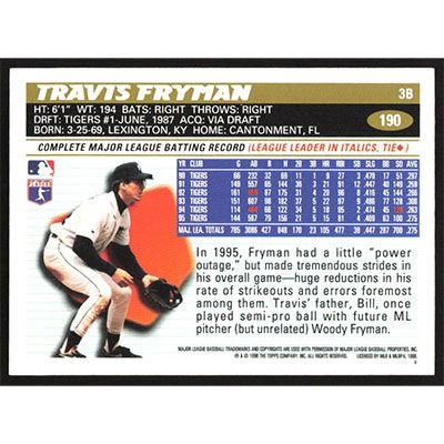 This is a 1996 Topps Travis Fryman baseball card. The card is #190 and pictures show condition.