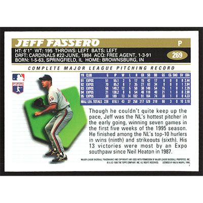 This is a 1996 Topps Jeff Fassero baseball card. The card is #269 and pictures show condition.