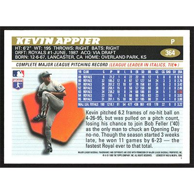 This is a 1996 Topps Kevin Appier baseball card. The card is #364 and pictures show condition.