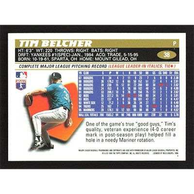 This is a 1996 Topps Tim Belcher baseball card. The card is #38 and pictures show condition.