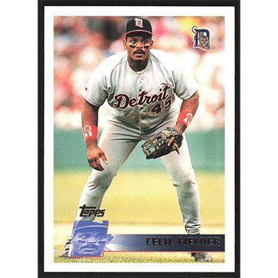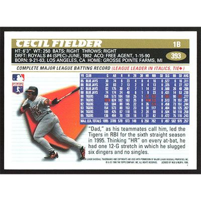 This is a 1996 Topps Cecil Fielder baseball card. The card is #393 and pictures show condition.