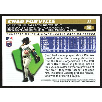 This is a 1996 Topps Chad Fonville baseball card. The card is #402 and pictures show condition.