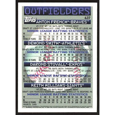 This is a 1996 Topps Anton French, Demond Smith, Darond Stovall and Keith Williams Prospects baseball card. The card is #437 and pictures show condition.