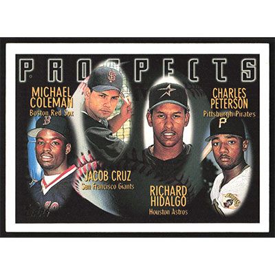 This is a 1996 Topps Michael Coleman, Jacob Cruz, Richard Hidalgo and Charles Peterson Prospects baseball card. The card is #438 and pictures show condition.