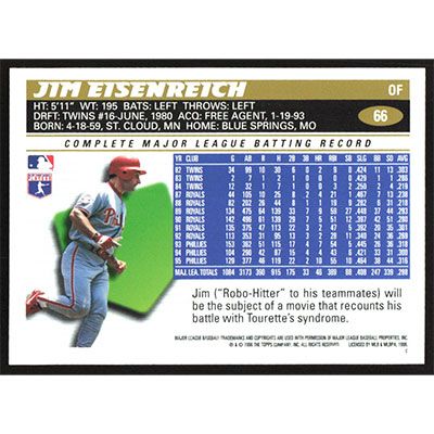 This is a 1996 Topps Jim Eisenreich baseball card. The card is #66 and pictures show condition.