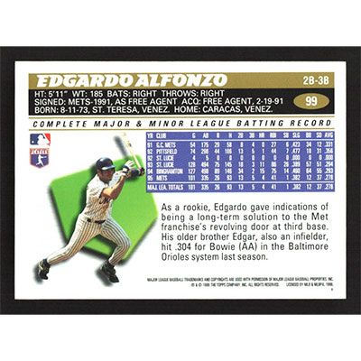 This is a 1996 Topps Edgardo Alfonzo baseball card. The card is #99 and pictures show condition.