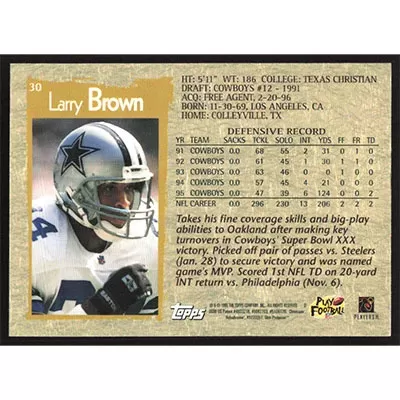 This is a 1996 Topps Chrome Larry Brown football card. The card is #30 and pictures show condition.