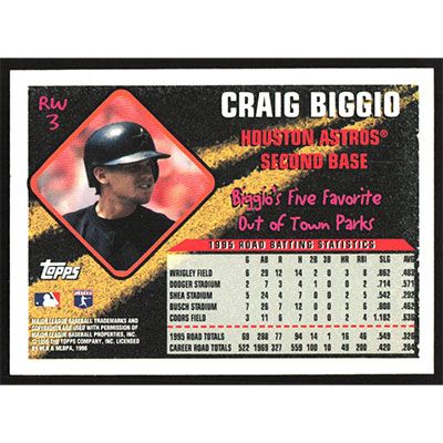 This is a 1996 Topps Road Warriors Craig Biggio baseball card. The card is #RW3 and pictures show condition.