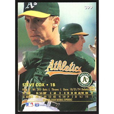 This is a 1996 Ultra Steve Cox baseball card. The card is #399 and pictures show condition.
