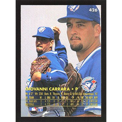 This is a 1996 Ultra Giovanni Carrara baseball card. The card is #426 and pictures show condition.