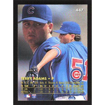 This is a 1996 Ultra Terry Adams baseball card. The card is #447 and pictures show condition.