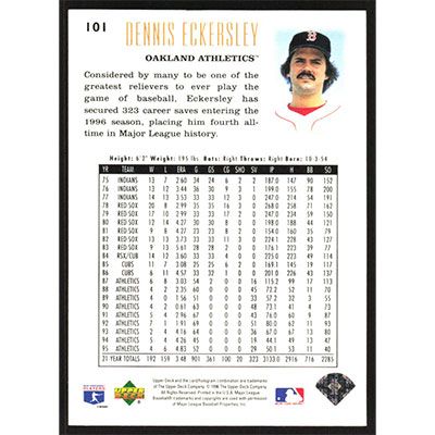 This is a 1996 Upper Deck Dennis Eckersley Young at Heart baseball card. The card is #101 and pictures show condition.