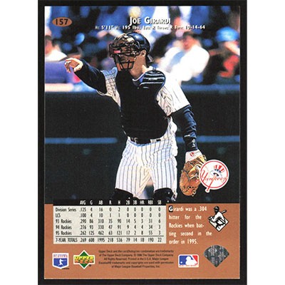 This is a 1996 Upper Deck Joe Girardi baseball card. The card is #157 and pictures show condition.