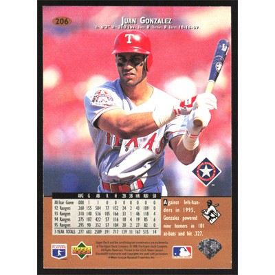 This is a 1996 Upper Deck Juan Gonzalez baseball card. The card is #206 and pictures show condition.