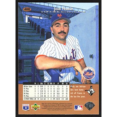 This is a 1996 Upper Deck John Franco baseball card. The card is #400 and pictures show condition.