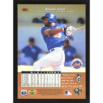 This is a 1996 Upper Deck Bernard Gilkey baseball card. The card is #402 and pictures show condition.