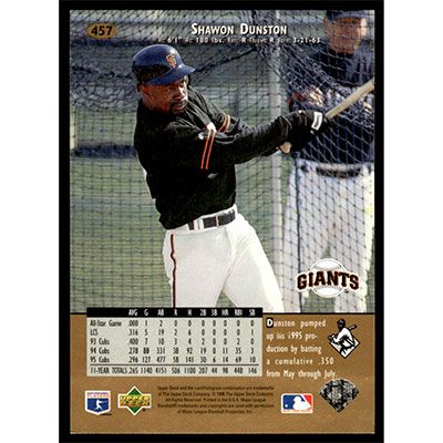 This is a 1996 Upper Deck Shawon Dunston baseball card. The card is #457 and pictures show condition.