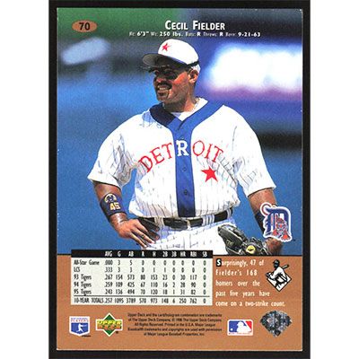 This is a 1996 Upper Deck Cecil Fielder baseball card. The card is #70 and pictures show condition.