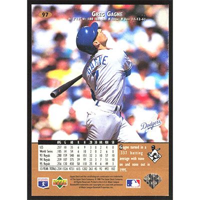 This is a 1996 Upper Deck Greg Gagne baseball card. The card is #97 and pictures show condition.