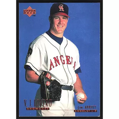 This is a 1996 Upper Deck V.J. Lovero Showcase Jim Abbott baseball card. The card is #VJ1 and pictures show condition.