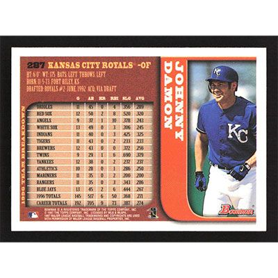 This is a 1997 Bowman Johnny Damon baseball card. The card is #287 and pictures show condition.