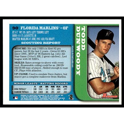 This is a 1997 Bowman Todd Dunwoody baseball card. The card is #90 and pictures show condition.