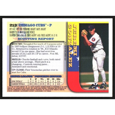 This is a 1997 Bowman Chrome International Jeremi Gonzalez baseball card. The card is #213 and pictures show condition.
