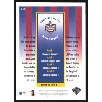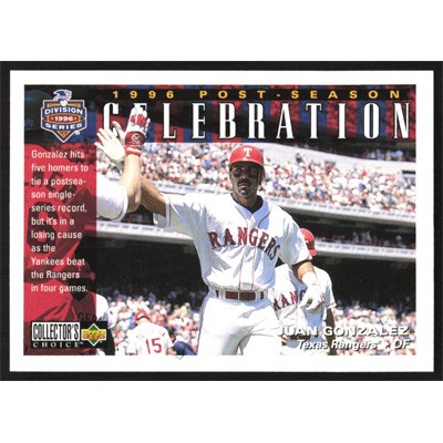 This is a 1997 Collector's Choice Juan Gonzalez Post-Season Celebration baseball card. The card is #218 and pictures show condition. Team(s): Texas Rangers