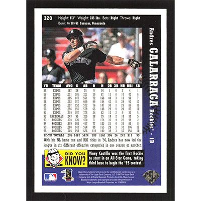 This is a 1997 Collector's Choice Andres Galarraga baseball card. The card is #320 and pictures show condition.