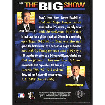 This is a 1997 Collector's Choice The Big Show Roger Clemens baseball card. The card is #10 and pictures show condition.