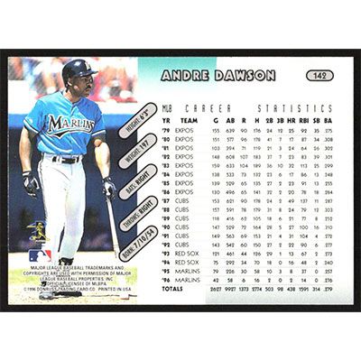 This is a 1997 Donruss Andre Dawson baseball card. The card is #142 and pictures show condition.