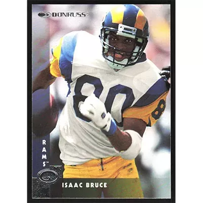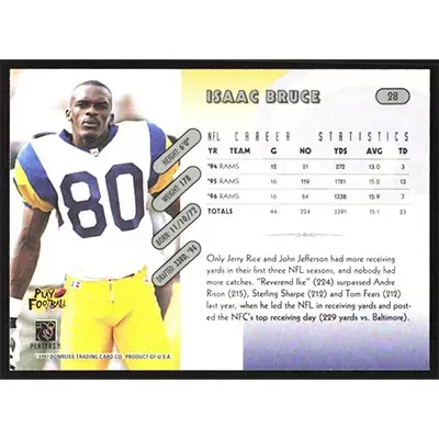 This is a 1997 Donruss Isaac Bruce football card. The card is #28 and pictures show condition.