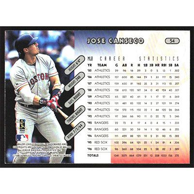 This is a 1997 Donruss Jose Canseco baseball card. The card is #54 and pictures show condition.