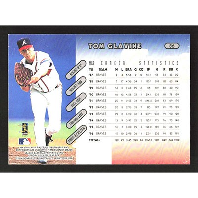 This is a 1997 Donruss Tom Glavine baseball card. The card is #86 and pictures show condition.