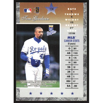 This is a 1997 Donruss Elite Tom Goodwin baseball card. The card is #134 and pictures show condition.