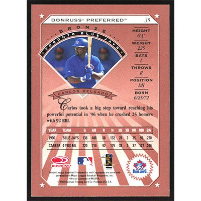 This is a 1997 Donruss Preferred Carlos Delgado Bronze baseball card. The card is #35 and pictures show condition.