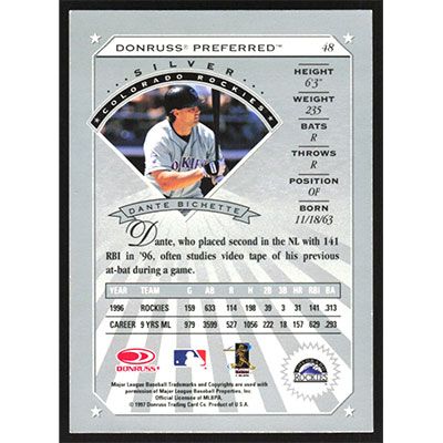 This is a 1997 Donruss Preferred Dante Bichette Silver baseball card. The card is #48 and pictures show condition.