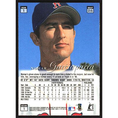 This is a 1997 Flair Showcase Row 1 Nomar Garciaparra baseball card. The card is #26 and pictures show condition.