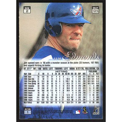 This is a 1997 Flair Showcase Row 2 Jim Edmonds baseball card. The card is #125 and pictures show condition.