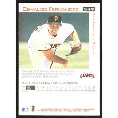 This is a 1997 Fleer Osvaldo Fernandez baseball card. The card is #549 and pictures show condition.