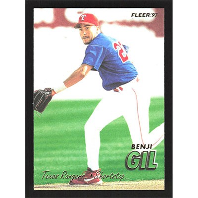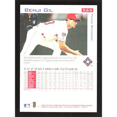 This is a 1997 Fleer Benji Gil baseball card. The card is #565 and pictures show condition.