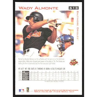 This is a 1997 Fleer Wady Almonte baseball card. The card is #613 and pictures show condition.