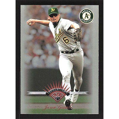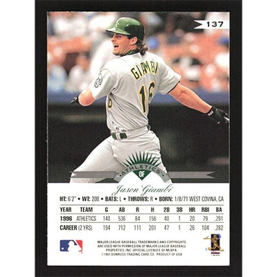 This is a 1997 Leaf Jason Giambi baseball card. The card is #137 and pictures show condition.