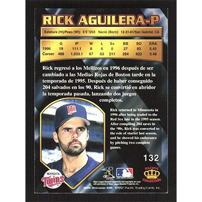 This is a 1997 Pacific Rick Aguilera baseball card. The card is #132 and pictures show condition.